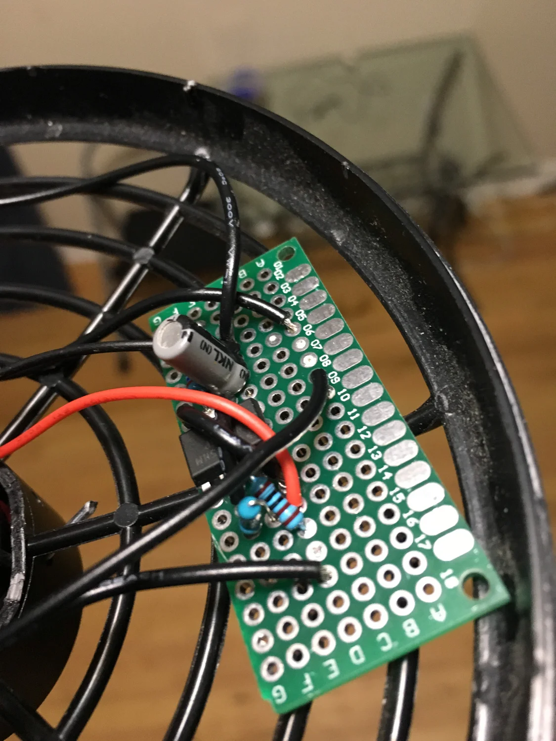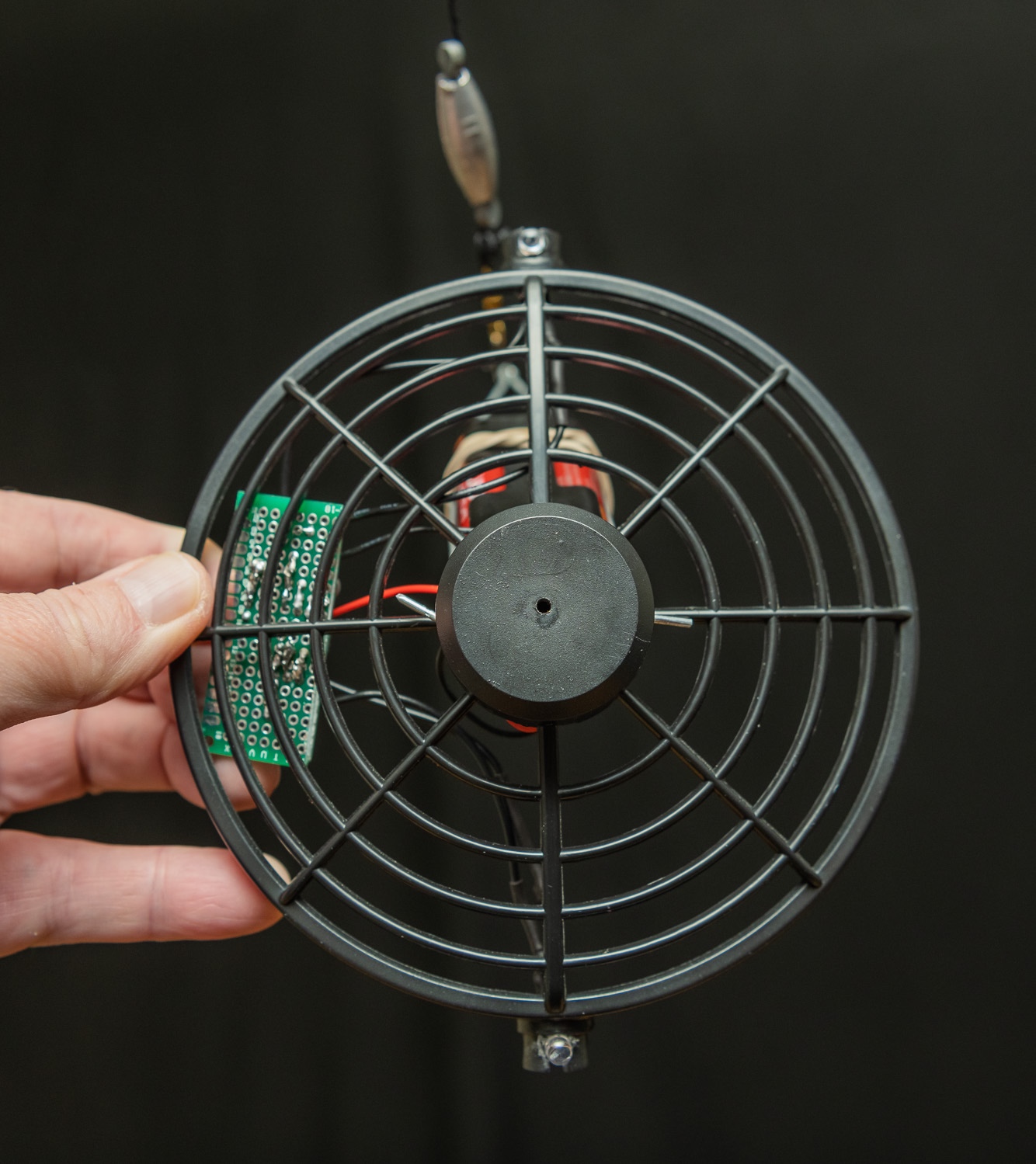 The fan housing used for the platform is black. This is pretty important as I didn’t want anything that might reflect the light from the LED and act as a secondary light source. The 555 timer is partially hidden under the wiring. The 6V battery pack was adequate to drive the LEDs and gave plenty of mass to help maintain the platform’s momentum.