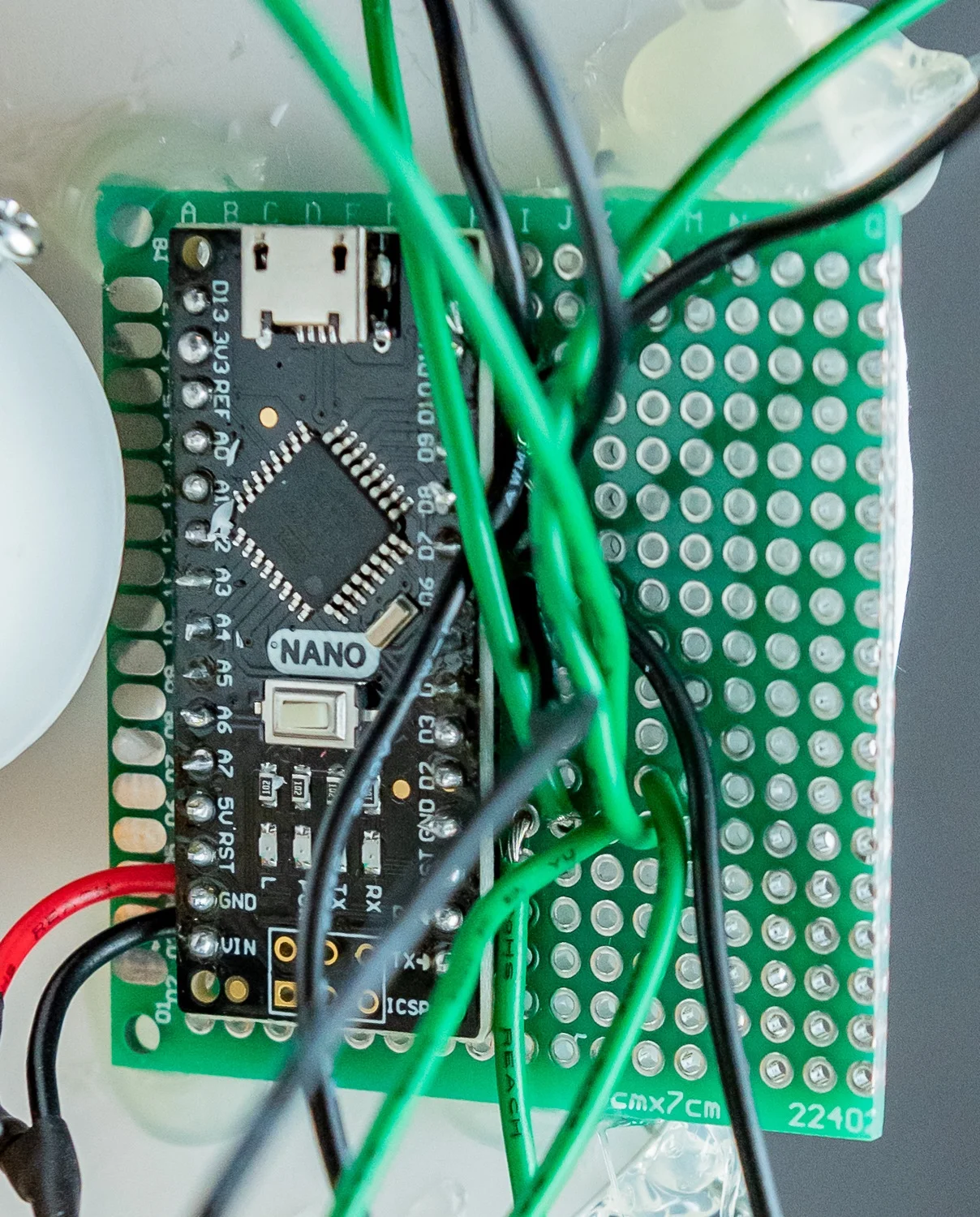 Prototype #2 was a bit more interesting and included a DC motor, with its own power supply, mounted inside a piece of PVC piping, which in turn was suspended from the ceiling. I also added several additional LEDs and programmed the Arduino to light each in sequence. The patterns were more intricate but I didn’t care for the randomness of the loops.